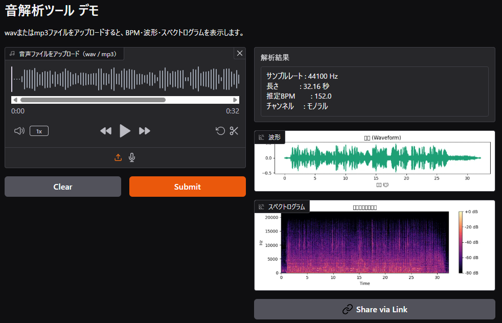 ブラウザから音声ファイルをアップロードするだけで、BPM・波形・スペクトログラムが即座に表示されます。インストール不要で誰でも使えます。